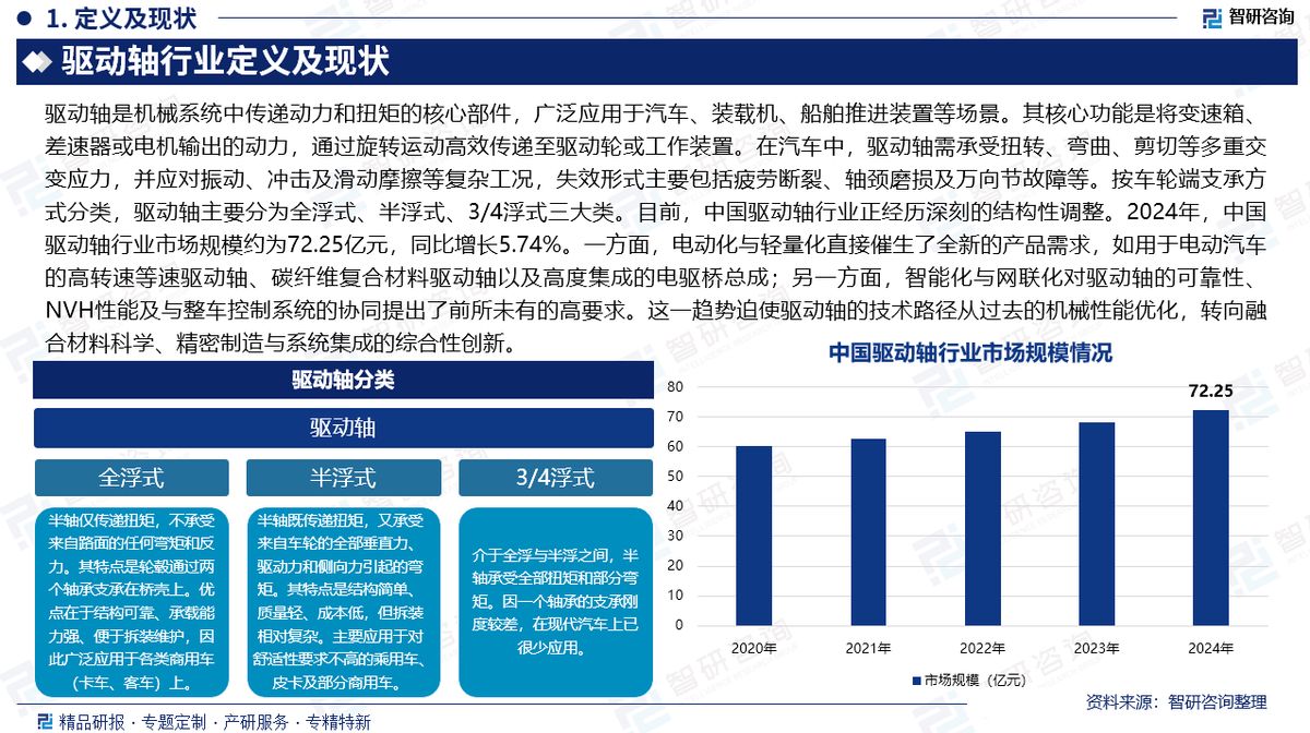 驱动轴是机械系统中传递动力和扭矩的核心部件,广泛应用于汽车、装载机、船舶推进装置等场景。其核心功能是将变速箱、差速器或电机输出的动力,通过旋转运动高效传递至驱动轮或工作装置。在汽车中,驱动轴需承受扭转、弯曲、剪切等多重交变应力,并应对振动、冲击及滑动摩擦等复杂工况,失效形式主要包括疲劳断裂、轴颈磨损及万向节故障等。按车轮端支承方式分类,驱动轴主要分为全浮式、半浮式、3/4浮式三大类。2024年,中国驱动轴行业规模达72.25亿元,同比增长5.74%。汽车产销量增长直接拉动需求,每辆车需1-2根驱动轴,新能源车型更催生高转速等速驱动轴、碳纤维复合材料轴及电驱桥总成等新需求。