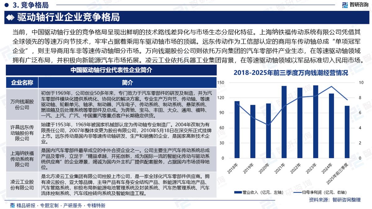 竞争情况:当前,中国驱动轴行业的竞争格局呈现出鲜明的技术路线差异化与市场生态分层化特征。上海纳铁福传动系统有限公司(GKN合资)凭借其全球领先的等速万向节(CVJ)技术,牢牢占据着乘用车驱动轴市场的顶端。远东传动作为工信部认定的商用车传动轴总成“单项冠军企业”,则主导商用车非等速传动轴细分市场。万向钱潮股份公司则依托万向集团的汽车零部件产业生态,在等速驱动轴领域拥有广泛布局,并积极向新能源汽车市场拓展。凌云工业依托兵器工业集团背景,在等速驱动轴领域以军品标准切入民用市场。